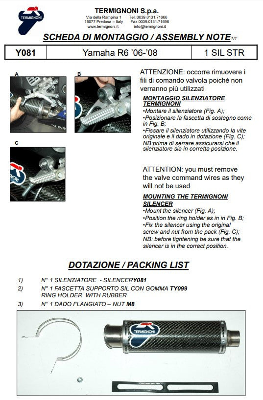 The Termignoni Slip-on Classic-GP for the Yamaha YZF-R6 (2006-2025) is a performance -optimized, homologated exhaustThe one for the Road operation is approved. With the Carbon-end silencer and that Stainless steel connection tube this slip-on kit offers one Noticeable increase in performance and one sporty optics. It is the ideal choice for drivers who more performance want to get out of her yamaha without the Road registration to have to do without.